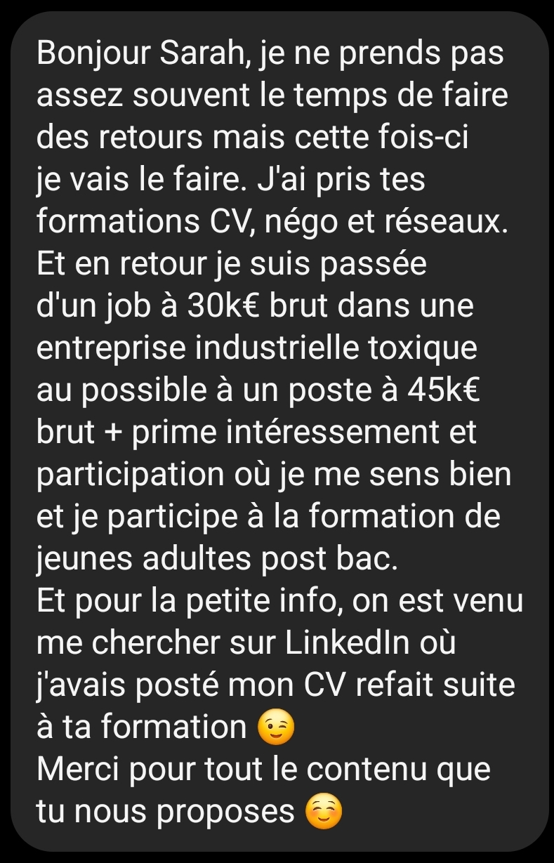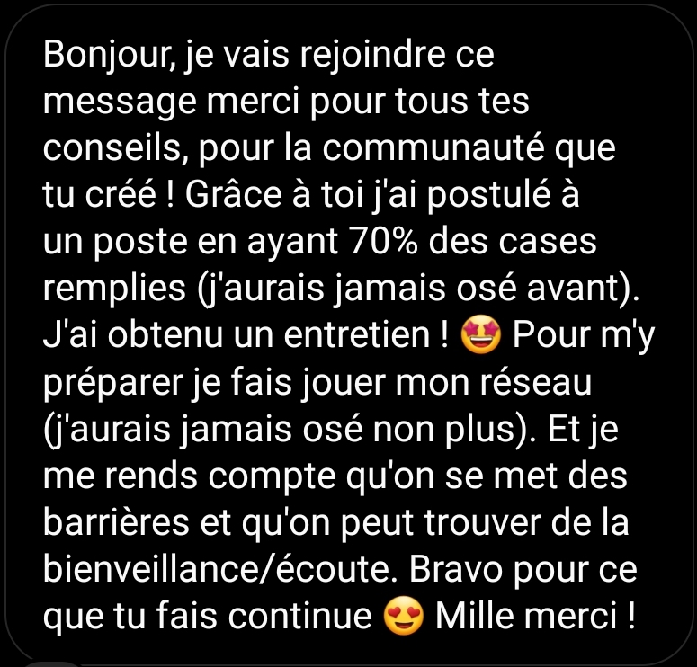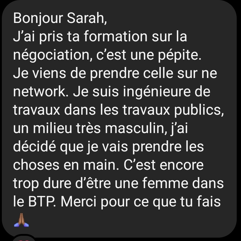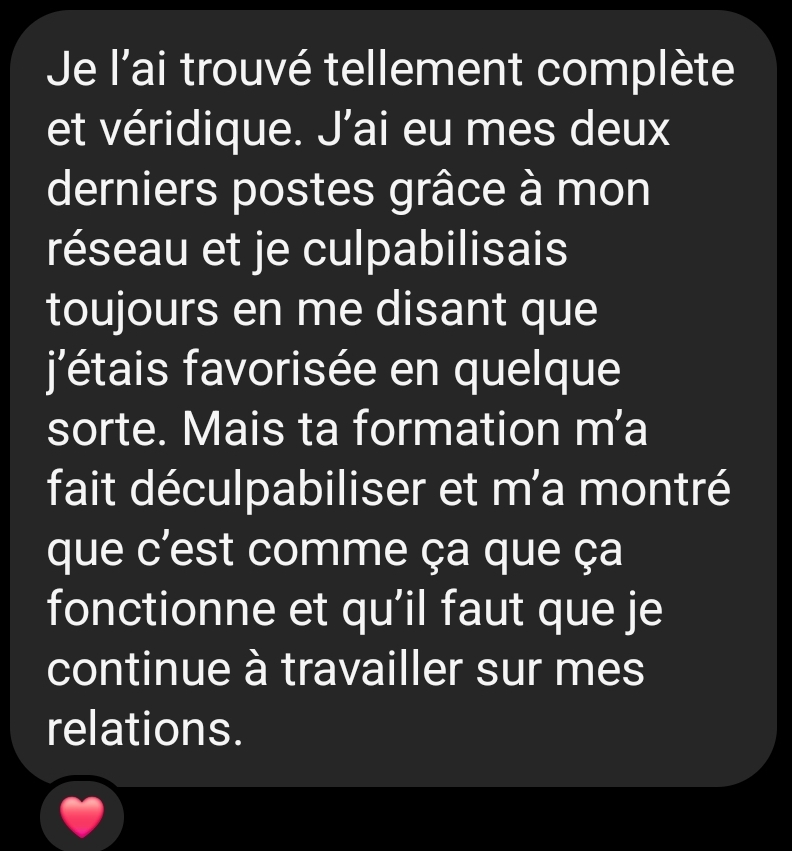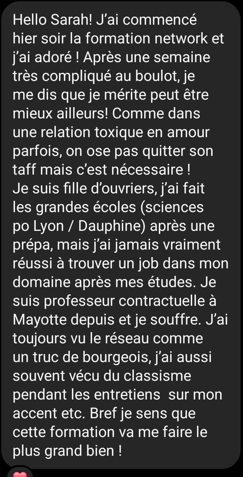 Dans la formation j’aborde le réseau dans le cadre de l’entreprise mais c’est en réalité un levier dans TOUS les domaines de ta vie, peu importe que tu sois cadre dans une boîte du CAC 40, salariée dans une start up, à ton compte, ou en pleine reconversion ! Le réseau est un outil stratégique qui te servira toute ta vie dans de nombreuses situations.
