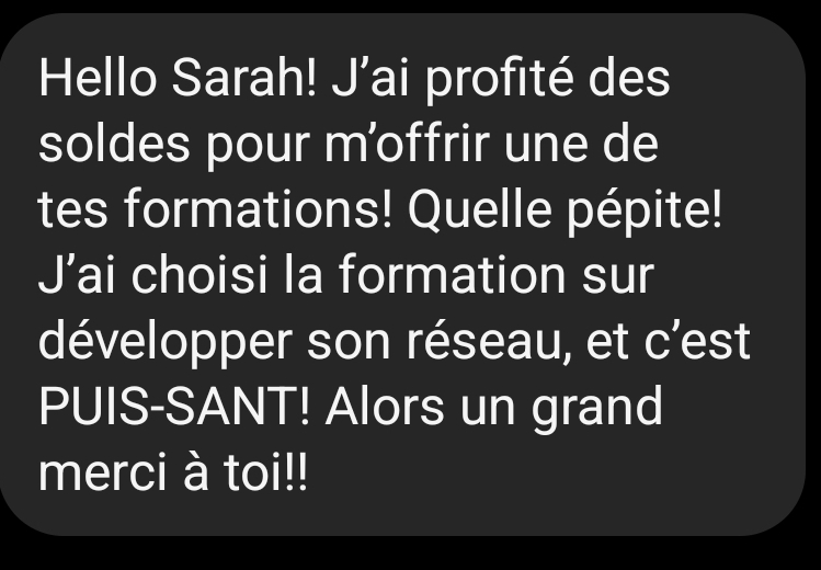 La formation est là pour t’aider à développer ton propre réseau, je ne vais pas te mettre en contact avec d’autres personnes. MAIS je vais t’apprendre à identifier les personnes clés de ton réseau et les activer comme il faut.