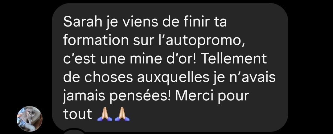 Comme c'est une formation vidéo, tu vas pouvoir la suivre à ton rythme et faire les exercices petit à petit pour doucement mais surement activer le réseau que tu as déjà et le nourrir pour qu'il grandisse et bosse pour toi ! Pour ce qui est de l'autopromo c’est un système hebdo qui tient en 10 minutes top chrono :
